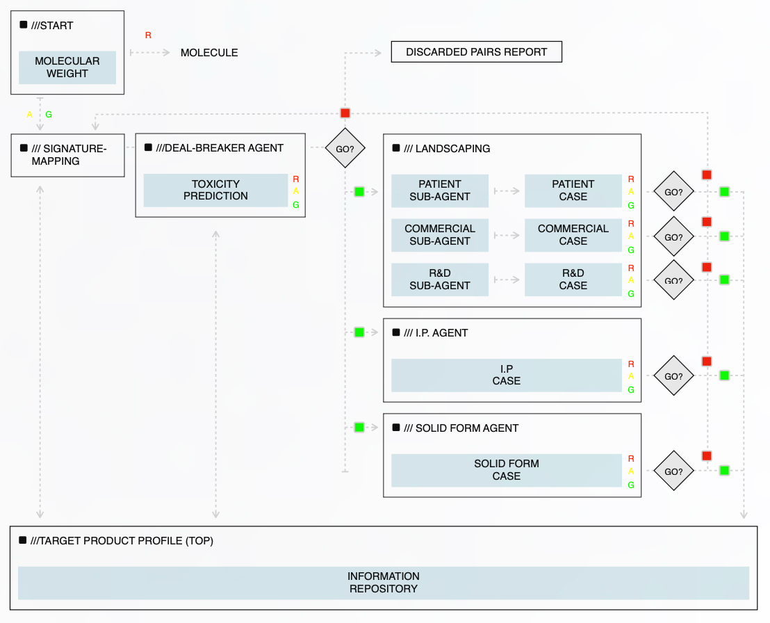 Multi-agent platform identifies repurposing, discovery & combination opportunities using >70 structured criteria — reducing human bias, academic friction & cycle time.