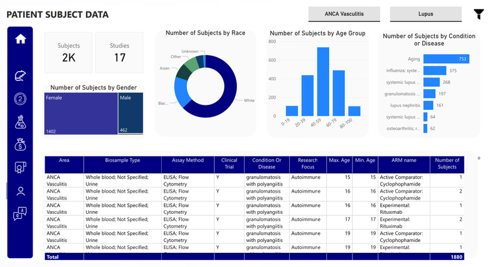 The image showcases data related to patient subject information from clinical trials that are either ongoing or recently completed. The data is categorized by key patient demographics, including gender, race, age group, and disease or condition. It can be customized to align with a company’s specific focus or therapeutic area, enabling clients to identify the appropriate patient types for their clinical trials, streamline and enhance patient recruitment processes and gain deeper insights into how different patient groups may respond to a drug.
