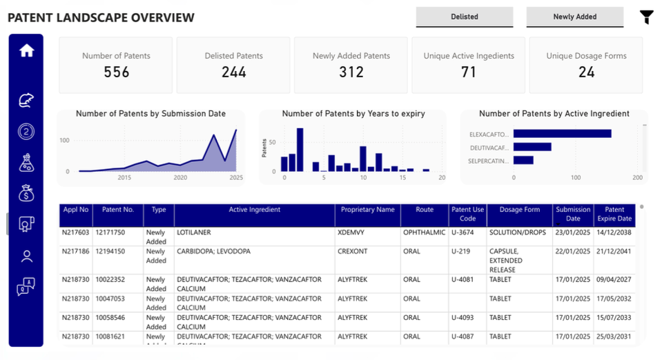 The image displays a dashboard developed for a Sarborg client. It includes information on patents that are nearing expiration, those that have been delisted, and those that have been recently approved or added to the database, aiming to provide pharmaceutical companies with a unique solution to identify and evaluate potential candidates for their future portfolio strategies.