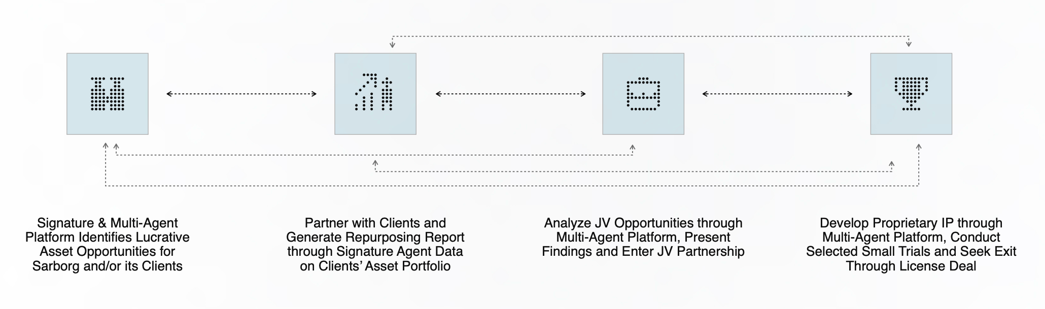 Once an asset is identified through the Signature Agent, Sarborg utilizes its proprietary technology and multi-agent platform to repurpose it into the most suitable indications, optimizing its therapeutic potential. Following this, the company has the flexibility to either develop the product further or license it out to partners, supported by comprehensive data generated from its findings.